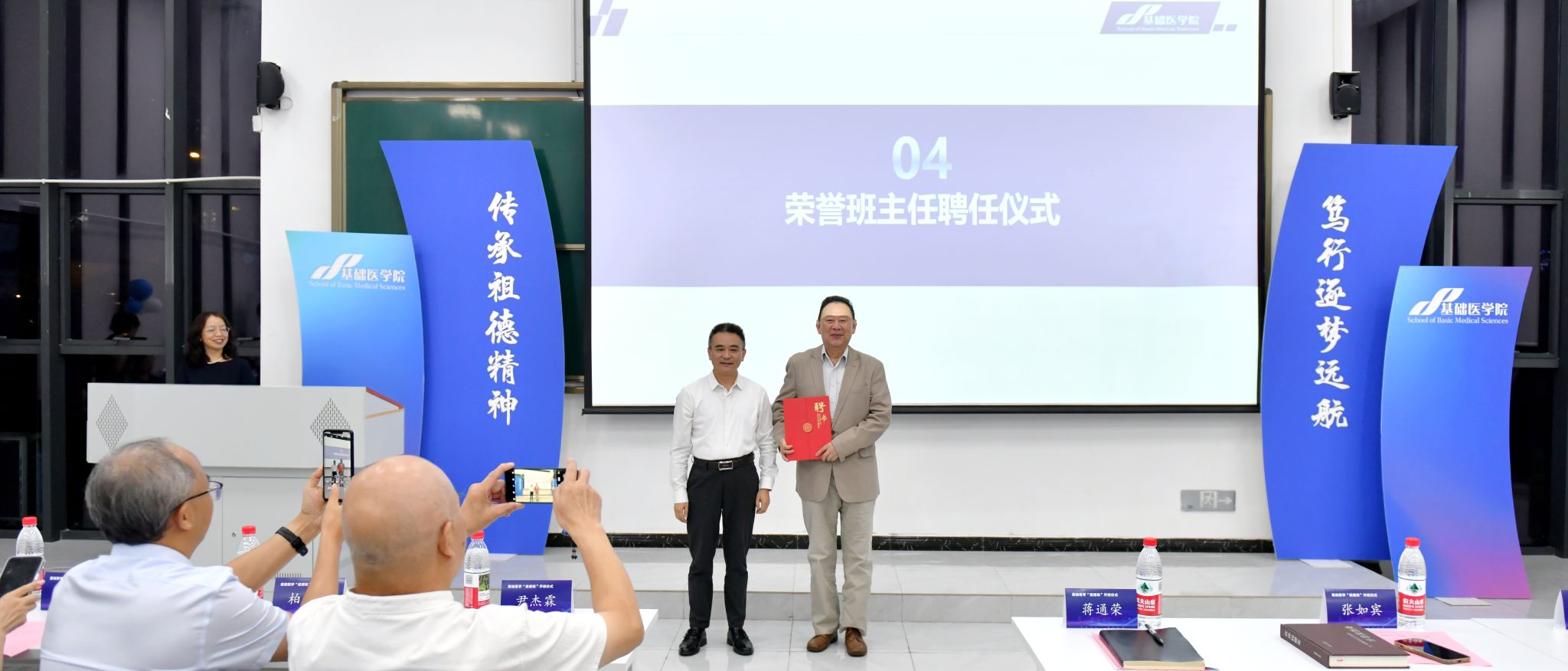 仪式上多个活动环节及议程育人氛围浓厚:尹杰霖现场捐赠专门为“祖德班”作的题词,内容传递了他对学子们的殷切期望;蒋通荣为张如宾颁发了“祖德班”荣誉班主任聘书,请他以家学渊源传递“祖德精神”力量;基础医学院领导班子为精心遴选的学业导师、学术导师颁发了聘书;导师代表还为学子赠送了承载“祖德精神”的纪念品,以“赠礼明志”寄寓成长期许。
